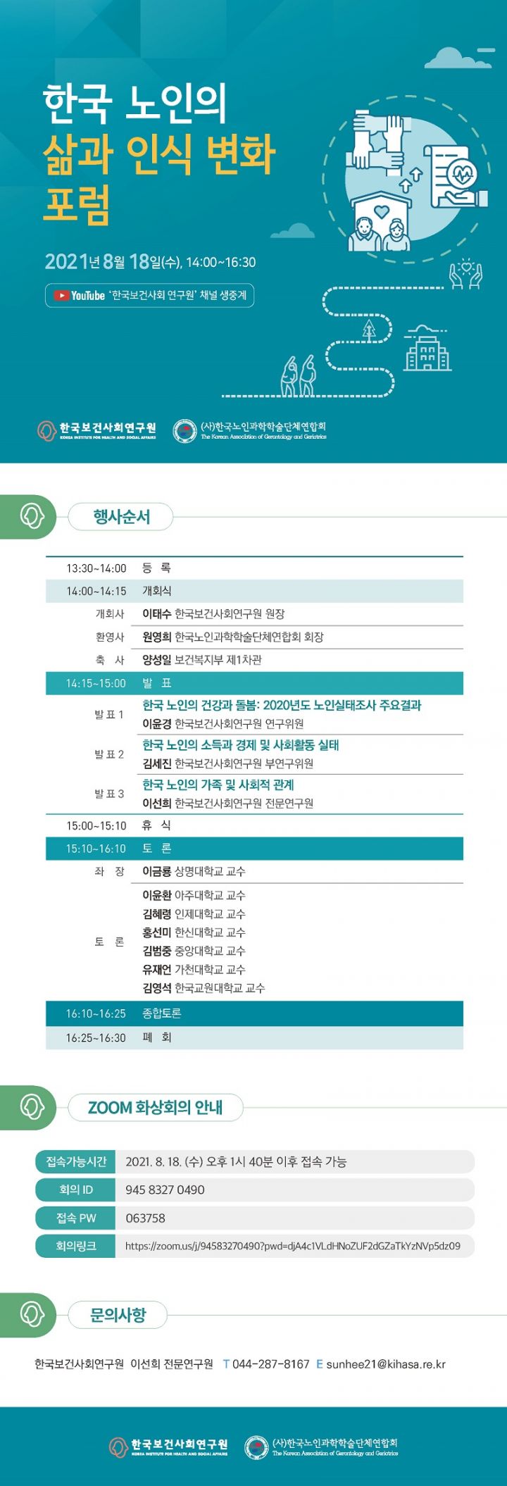 본 학회가 회원학회로 소속된 (사)한국노인과학학술단체연합회에서는 한국보건사회연구원과의 공동포럼인 '한국 노인의 삶과 인식 변화 포럼'을 개최합니다.