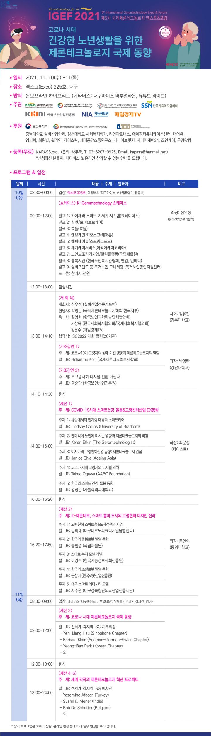 (사)한국노인과학학술단체연합회는 11월 10일부터 11일까지 실버산업전문가포럼과 ISG 국제제론테크놀로지학회와 공동주관으로 제5차 국제제론테크놀로지 엑스포를 진행합니다.