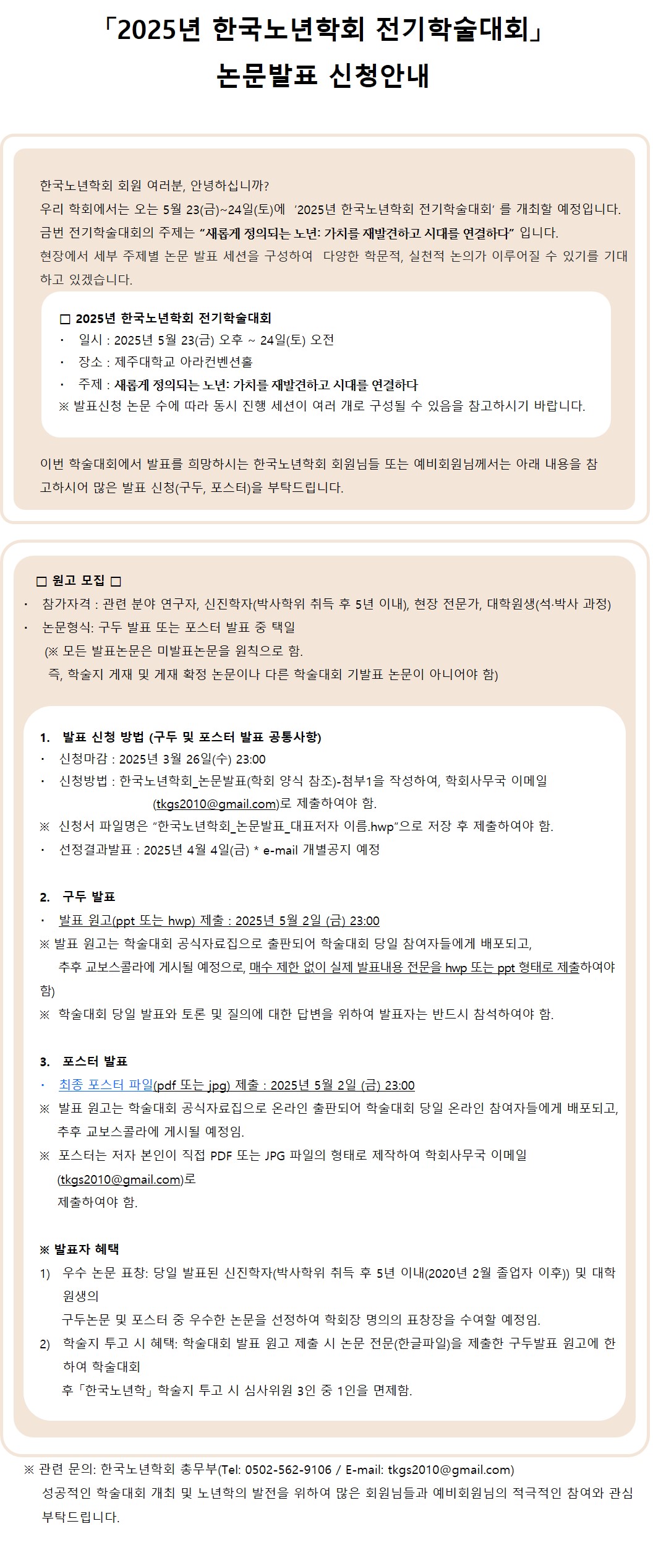 2025년 한국노년학회 전기학술대회 구두 및 포스터 발표 모집 안내