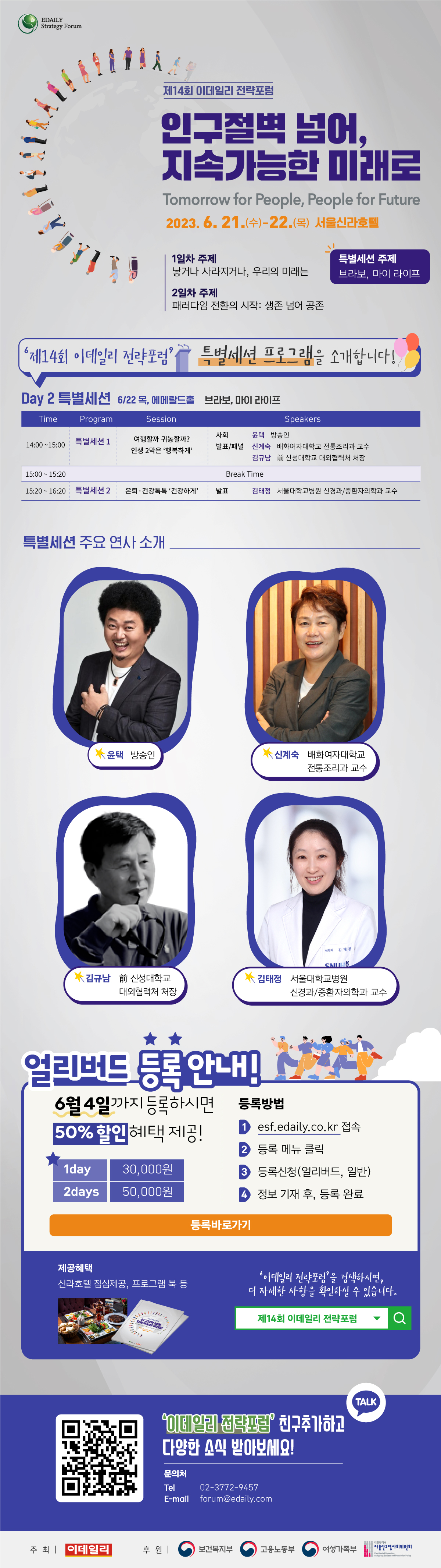 오는 6월 21일(수)부터 22일(목)까지 서울 신라호텔에서 개최되는 「제14회 이데일리 전략포럼」은 ‘인구절벽 넘어, 지속가능한 미래로’를 주제로 열립니다.