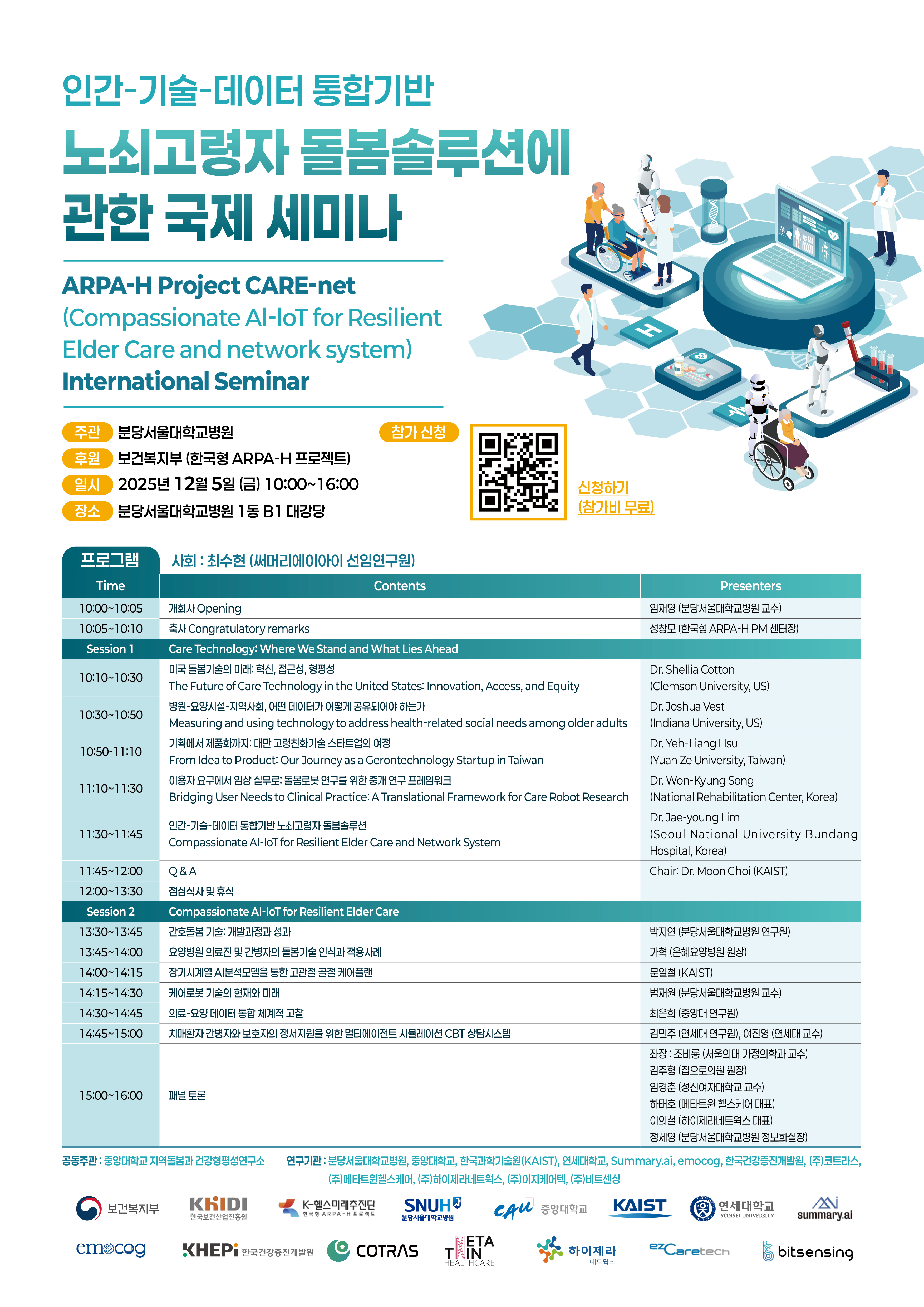 (12/5) [분당서울대학교병원] 《인간-기술-데이터 통합기반 노쇠고령자 돌봄솔루션에 관한 국제 세미나》