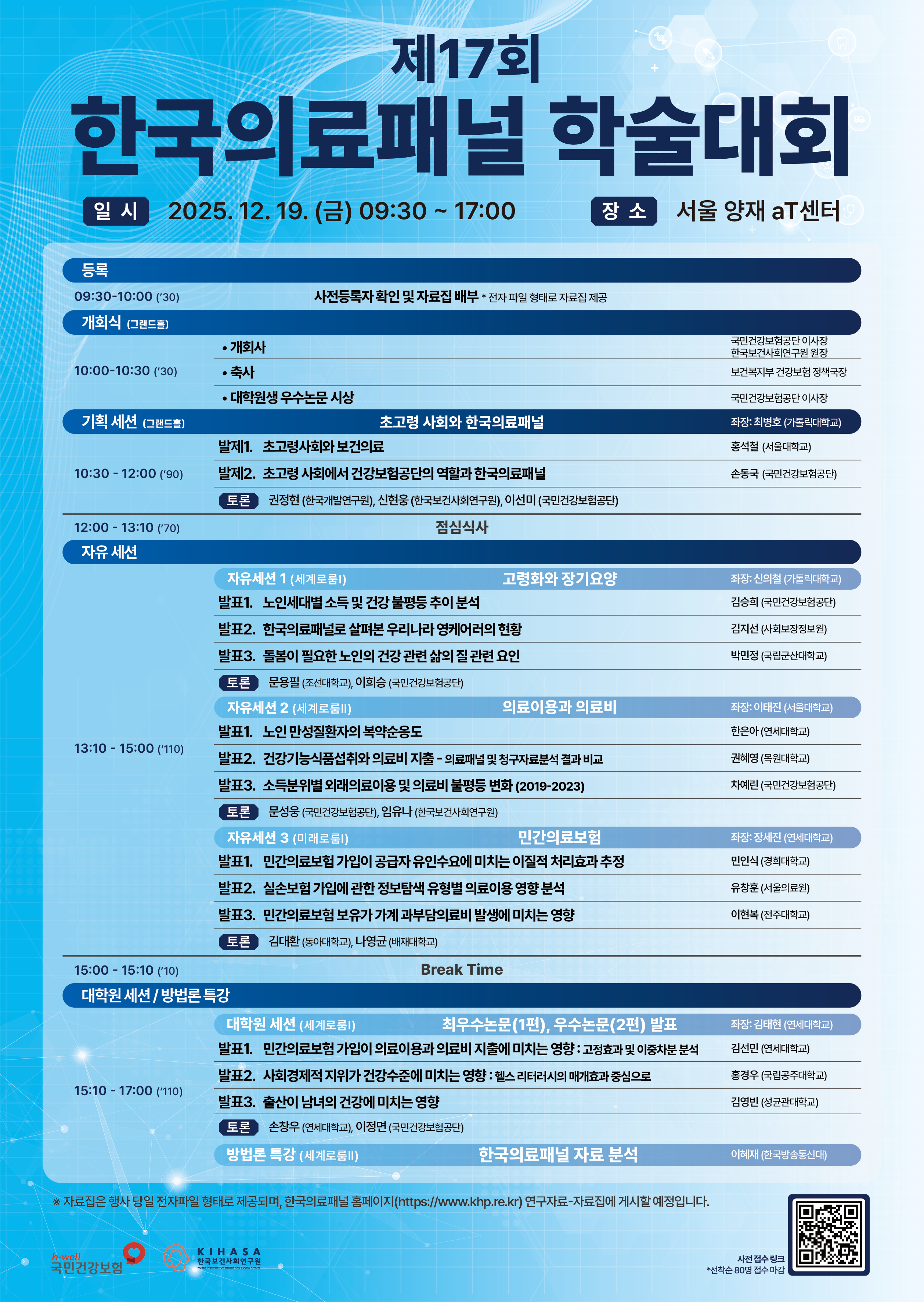 이번 학술대회를 통해 한국의료패널이 우리나라 보건의료 및 건강보장정책과 관련 학술·정책연구 발전에 기여할 수 있도록 많은 관심과 참여를 부탁드립니다.