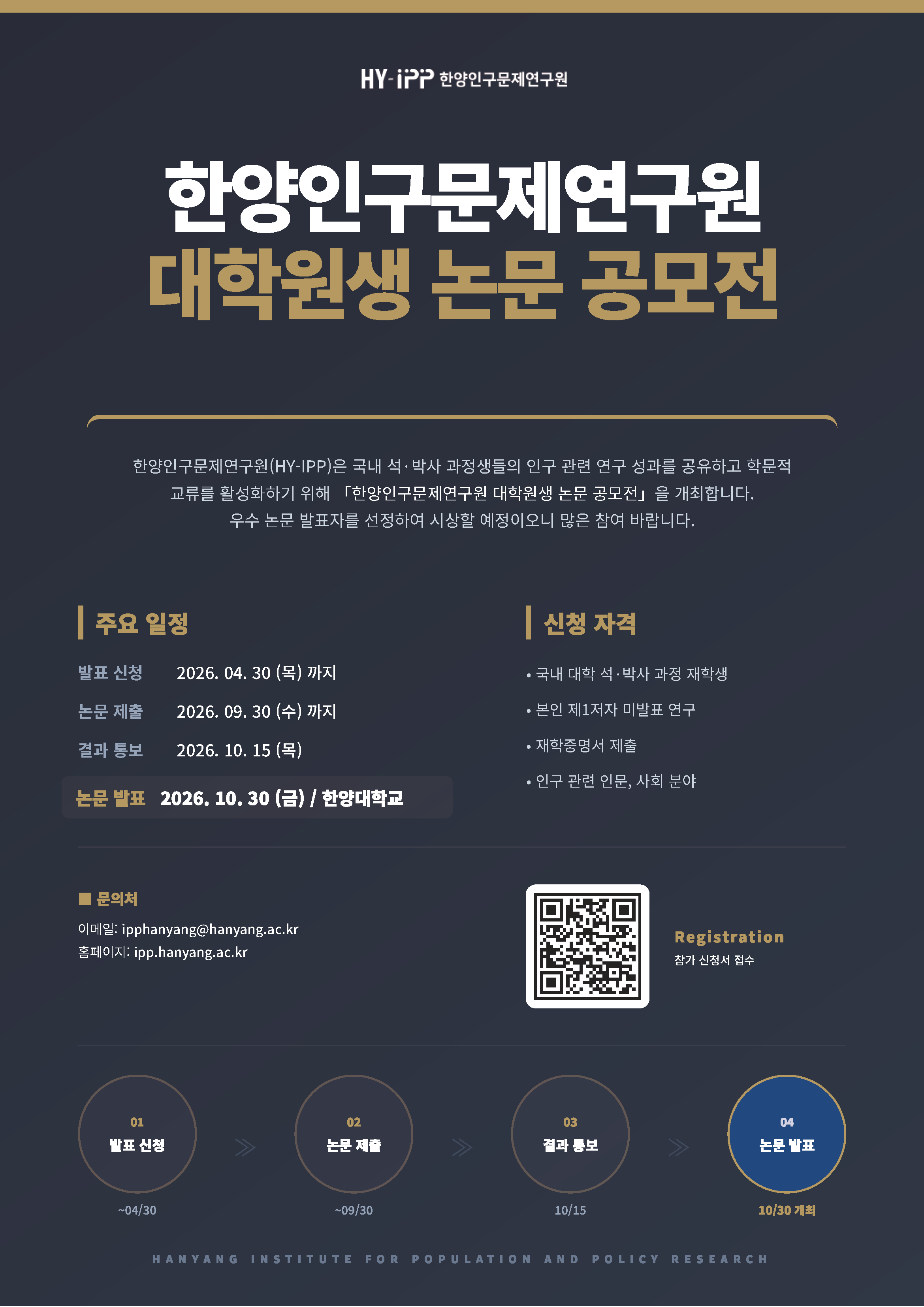 한양인구문제연구원(HY-IPP)은 국내 석·박사 과정생들의 인구 관련 연구 성과를 공유하고 학문적 교류를 활성화하기 위해 「한양인구문제연구원 대학원생 논문 공모전」을 개최합니다. 본 공모전은 인구 관련 연구를 응원하고 대학원생의 성장을 지원하기 위해 마련되었습니다. 인구와 관련된 고민, 문제, 정책 과제를 다양한 데이터를 사용하여 깊이 있게 분석한 연구 성과를 발굴하고, 이를 통해 인구와 관련 정책 논의가 더욱 확산되기를 바랍니다.
