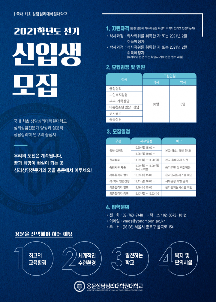 - 입학문의 : 용문상담심리대학원대학교 (☎ 02 - 763 - 7448)