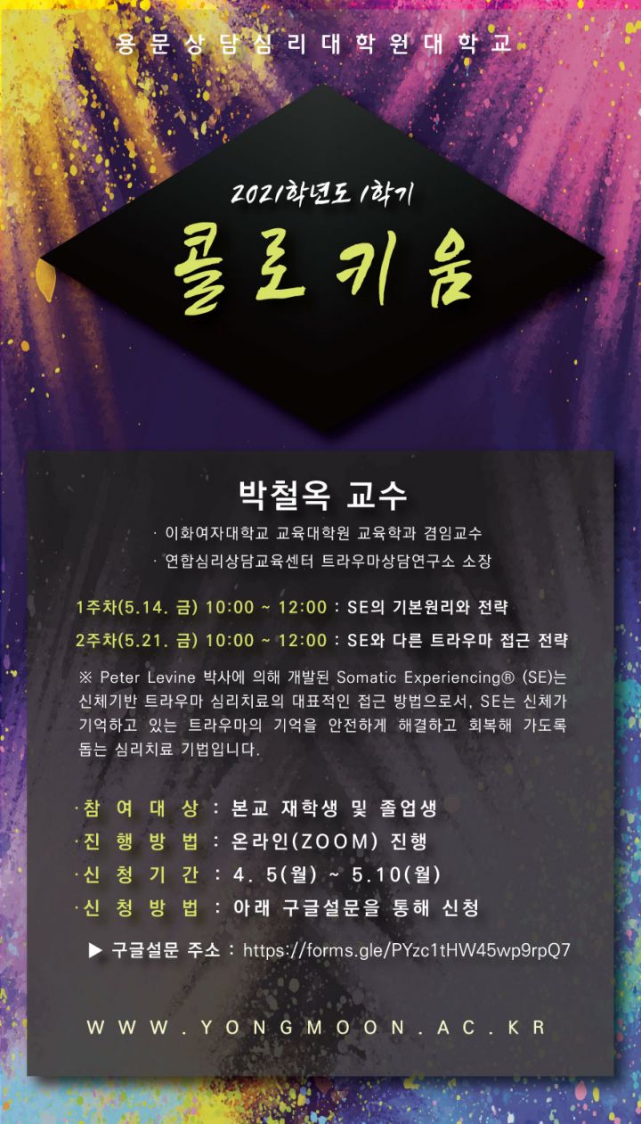 아래와 같이 본교에서 이화여자대학교 교육대학원 박철옥 교수님을 모시고 신체기반 트라우마 심리치료의 대표적인 접근 방법인 SE(Somatic Experiencing)의 기본원리와 전략, SE와 다른 트라우마 접근 전략에 대한 콜로키움을 온라인(Zoom)으로 실시하고자 합니다. 관심있는 분들의 많은 참여 바랍니다.