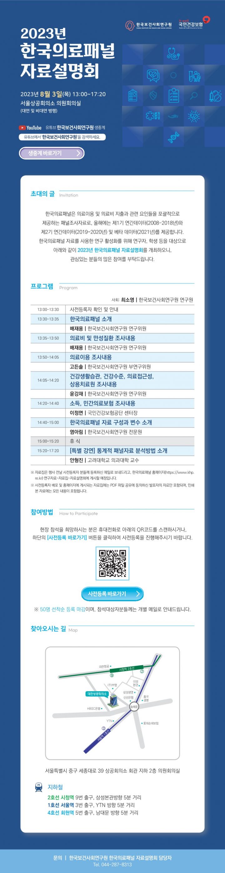 한국보건사회연구원과 국민건강보험공단이 공동으로 ‘2023년 한국의료패널 자료설명회’를 개최합니다.