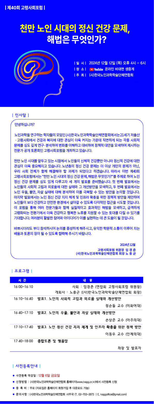 * 주제 : 천만 노인 시대의 정신 건강 문제, 해법은 무엇인가?