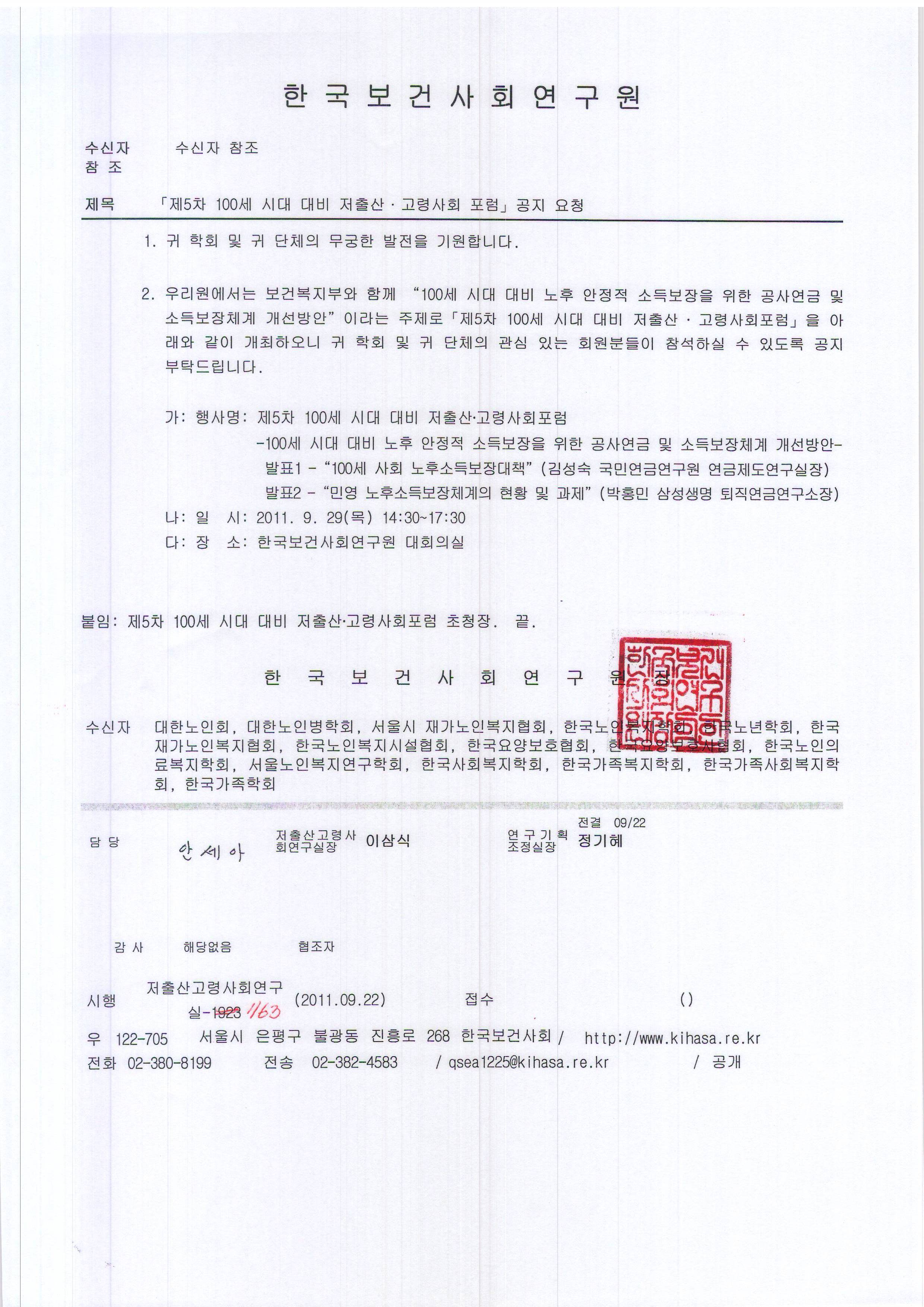 인생 100세 시대 및 초저출산 시대에 사회발전의 지속가능성을 담보하고 개인의 삶의 질을 향상시키기 위해 보건복지부 주최, 한국보건사회연구원 주관으로 <100세 시대 대비 저출산 고령사회 포럼>을 실시하고 있습니다.