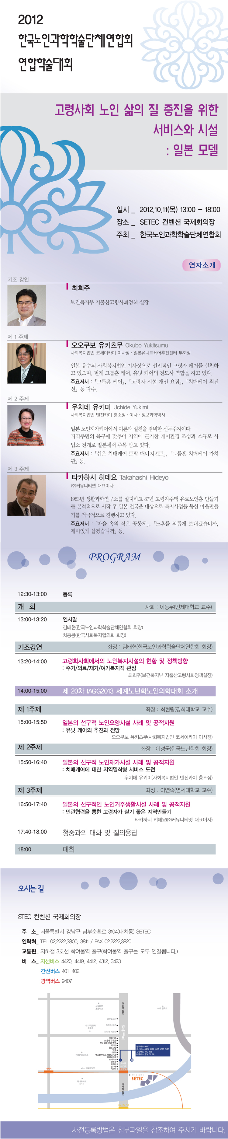 2012년 한국노인과학학술단체 연합회에서 마련하는 연합학술대회가 아래와 같이 마련되오니 학회 여러분의 많은 참여 부탁드립니다.